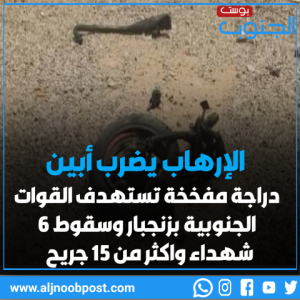 الإرهاب يضرب أبين.. دراجة مفخخة تستهدف القوات الجنوبية بزنجبار وسقوط 6 شهداء واكثر من 15 جريح