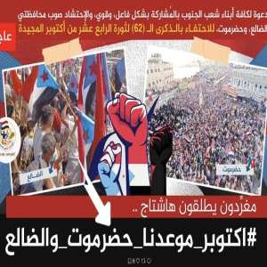 سياسيون ونشطاء جنوبيون يدعون أبناء شعب الجنوب إلى الإحتشاد بالضالع وحضرموت في ذكرى 14 أكتوبر المجيدة ويطلقون وسم #اكتوبر_موعدنا_حضرموت_والضالع