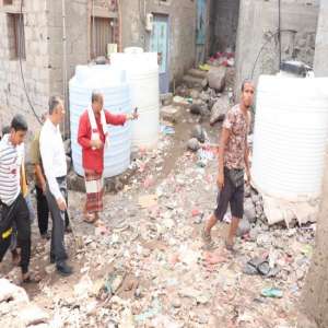 مأمور المعلا ورئيس اللجان ورابطة أبناء الشيخ اسحاق حي 22يونيو يشرفان على توزيع خزانات مياه للأحياء الجبلية