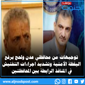 توجيهات من محافظي عدن ولحج برفع اليقظة الأمنية وتشديد اجراءات التفتيش في المنافذ الرابطة بين المحافظتين