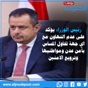 رئيس الوزراء يؤكد على عدم التهاون مع اي جهة تحاول المساس بأمن عدن ومواطنيها وترويع الامنين