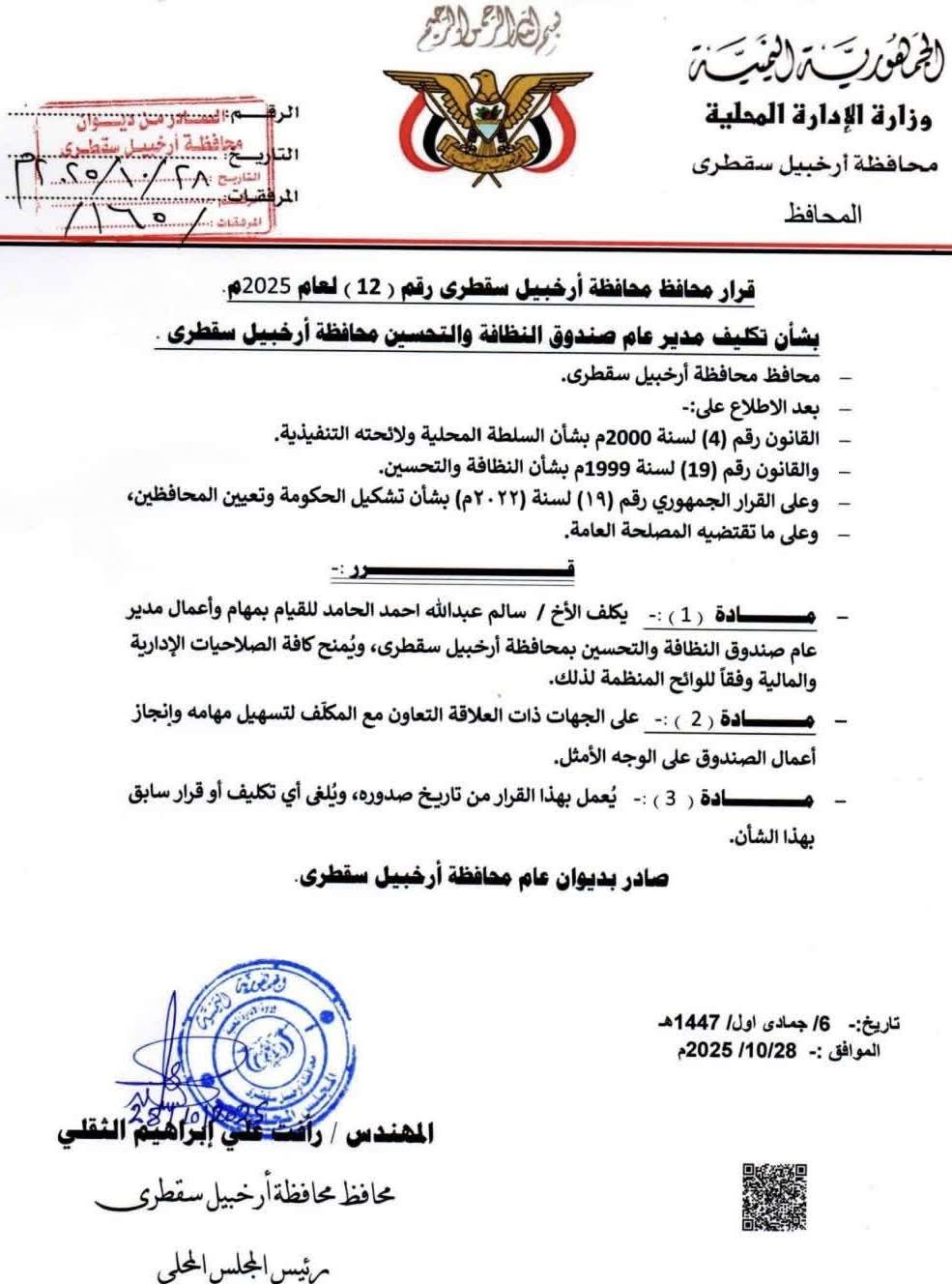 صادر بديوان عام محافظة أرخبيل سقطرى،بتاريخ 6 جمادى الأولى 1447هـ الموافق 28 أكتوبر 2025م.