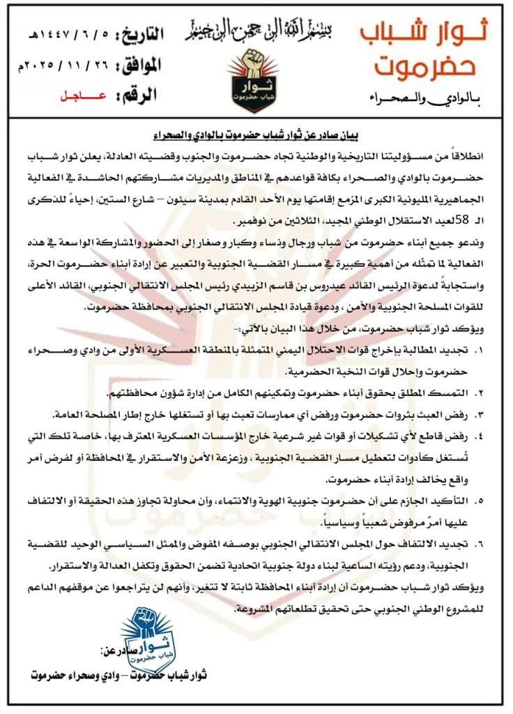 انطلاقاً من مسؤوليتنا التاريخية والوطنية تجاه حضرموت والجنوب وقضيته العادلة، يعلن ثوار شباب حضرموت بالوادي والصحراء بكافة قواعدهم في المناطق والمديريات مشاركتهم الحاشدة في الفعالية الجماهيرية المليونية الكبرى المزمع إقامتها يوم الأحد القادم بمدينة سيئون – شارع الستين، إحياءً للذكرى الـ 58 لعيد الاستقلال الوطني المجيد، الثلاثين من نوفمبر.