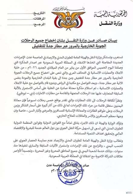 تستغرب وتستنكر وزارة النقل والهيئة العامة للطيران المدني والأرصاد في العاصمة عدن، الإجراءات الجديدة المفاجئة التي اتخذها الأشقاء في المملكة العربية السعوية عبر إصدار المذكرة التي وصلتنا اليوم الخميس الموافق الأول من يناير من العام الميلادي الجديد ٢٠٢٦م، من خلية الإجلاء والعمليات الإنسانية في التحالف العربي، والتي تنص على إخضاع جميع الرحلات الجوية الخارجية بالمرور عبر مطار جدة للتفتيش، ومن جدة إلى بقية البلدان الخارجية والعودة بنفس الآلية عبر مطار جدة.. وبعد التواصل مع مكتبنا في الرياض، وبدوره قام بالتواصل مع خلية الإجلاء والعمليات الإنسانية، تم استلام مذكرة معدلة صادرة عن الخلية على أساس الاستمرار بالآلية السابقة المتعارف عليها عدا الرحلات المتجهة والقادمة من مطارات الإمارات (دبي - أبوظبي).