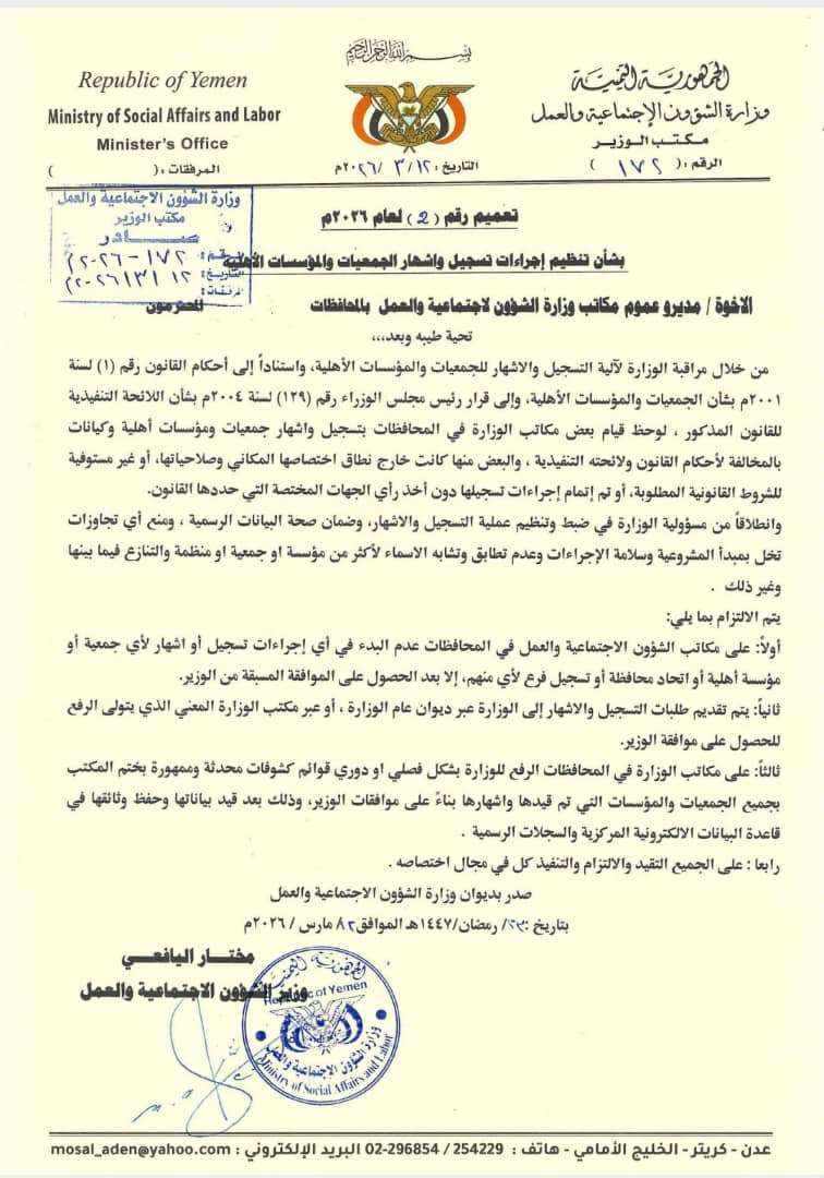 أصدر معالي وزير الشؤون الاجتماعية والعمل، مختار اليافعي، تعميماً رقم (2) لسنة 2026م بشأن تنظيم إجراءات تسجيل وإشهار الجمعيات والمؤسسات الأهلية، موجَّهًا إلى مديري عموم مكاتب الوزارة في المحافظات، وذلك بهدف تعزيز ضبط وتنظيم عملية التسجيل والإشهار وضمان الالتزام بالقوانين واللوائح المنظمة لعمل منظمات المجتمع المدني.