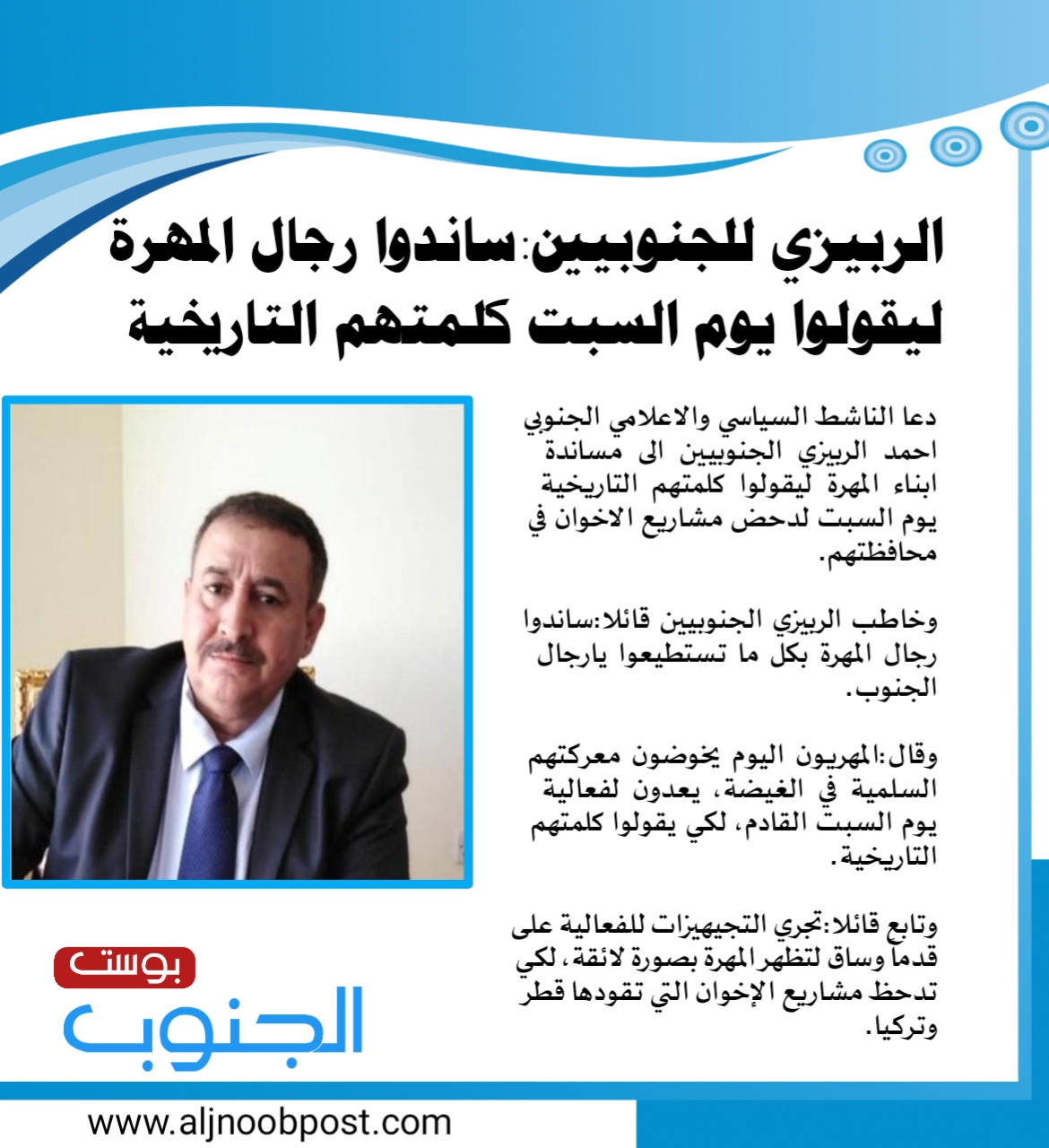 دعا الناشط السياسي والاعلامي الجنوبي احمد الربيزي الجنوبيين الى مساندة ابناء المهرة ليقولوا كلمتهم التاريخية يوم السبت لدحض مشاريع الاخوان في محافظتهم.