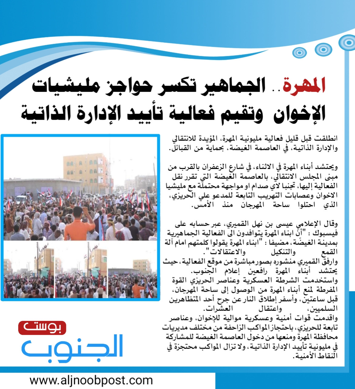واقدمت قوات أمنية وعسكرية موالية للإخوان، وعناصر تابعة للحريزي، باحتجاز المواكب الزاحفة من مختلف مديريات محافظة المهرة ومنعها من دخول العاصمة الغيضة للمشاركة في مليونية تأييد الإدارة الذاتية، ولا تزال المواكب محتجزة في النقاط الأمنية.