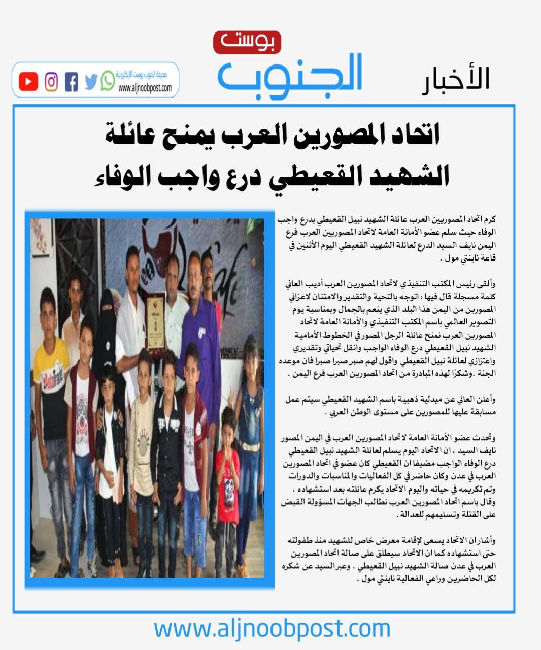 اتحاد المصورين العرب يمنح عائلة الشهيد القعيطي درع واجب الوفاء