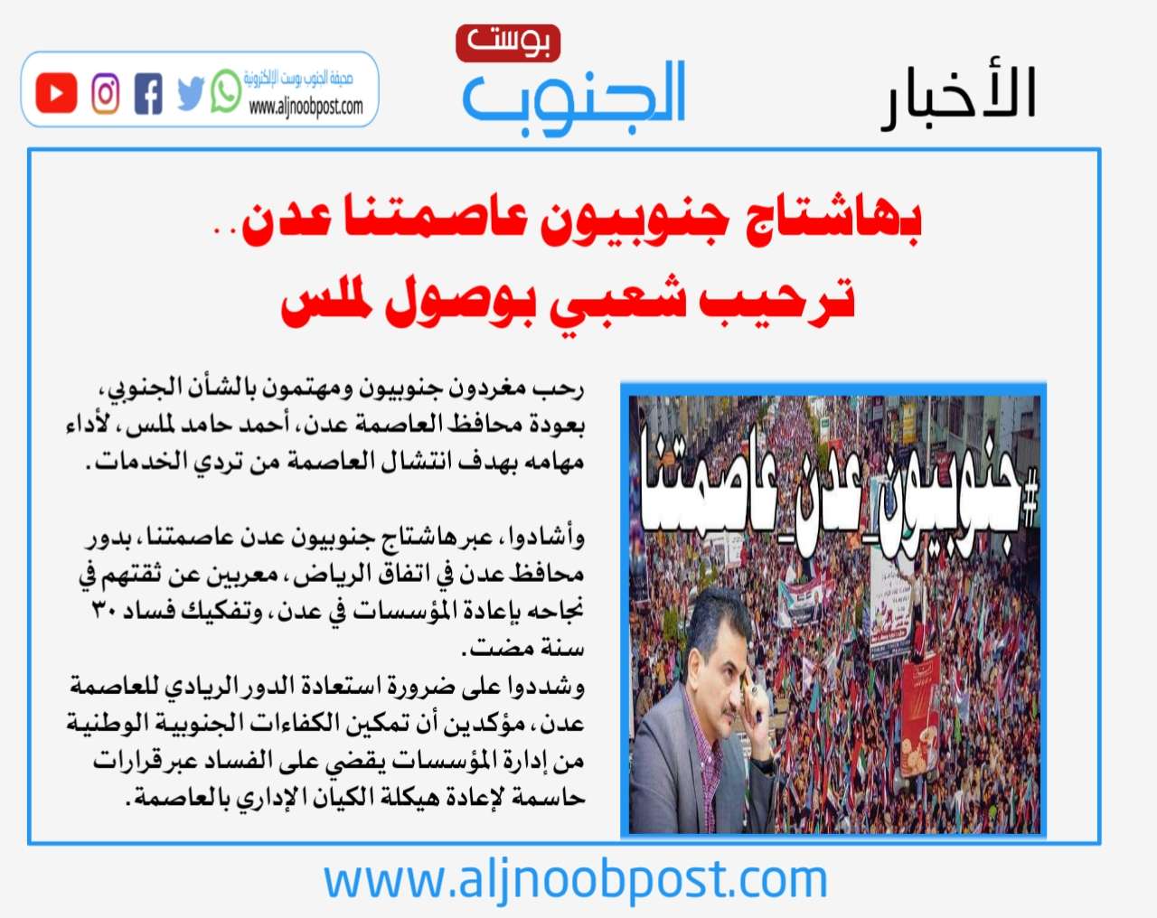 وأشادوا، عبر هاشتاج جنوبيون عدن عاصمتنا، بدور محافظ عدن في اتفاق الرياض، معربين عن ثقتهم في نجاحه بإعادة المؤسسات في عدن، وتفكيك فساد ٣٠ سنة مضت.