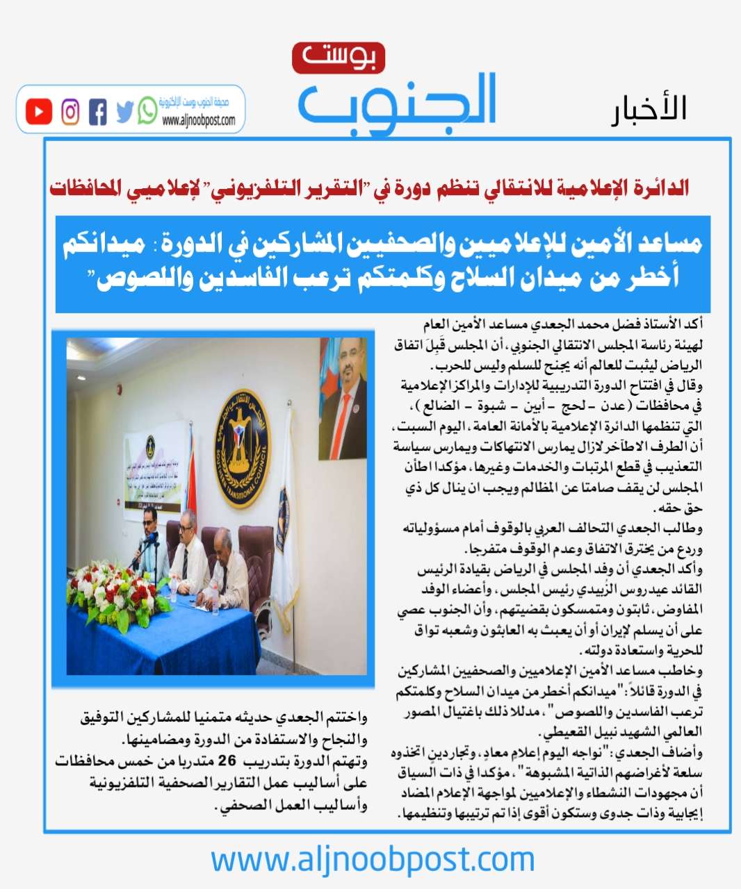 الدائرة الإعلامية للانتقالي تنظم دورة في "التقرير التلفزيوني" لإعلاميي المحافظات