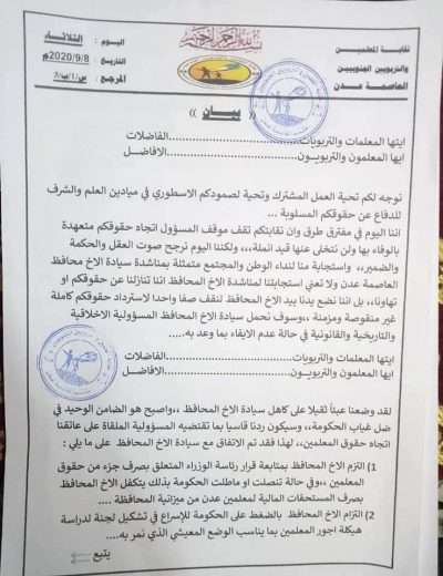 وكانت النقابة المستجدة اخذت التزاما من محافظ عدن بصرف الاستحقاقات المطلوبة من ميزانية المحافظة اذا لم تصرفها الحكومة ، كما اخذت التزاما من المحافظ بدعم صحيفة ( المعلم ) التي تصدر شهريا عن هذه النقابة ، كما ورد في بيانها الصادر اليوم.