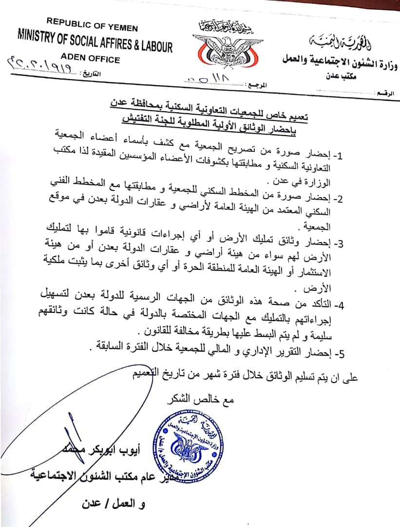 مكتب وزارة الشؤون الاجتماعية والعمل في العاصمة عدن تصدر تعميم هام للجمعيات التعاونية السكنية