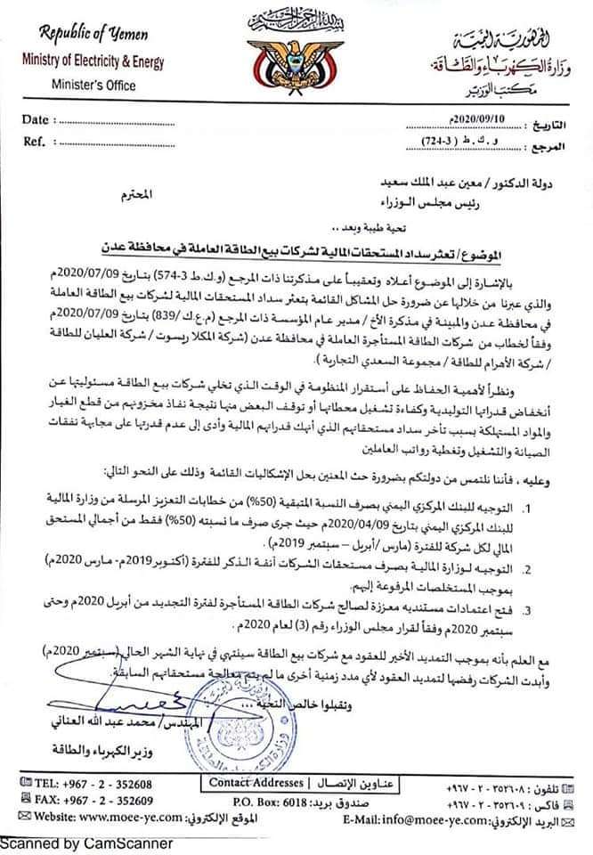 وبعثت وزارة الكهرباء، مذكرتان الاولى بتاريخ 10 والاخرى اليوم بتاريخ 14 سبتمبر، تتضمنان تحذيرات ومطالبات بسرعة توجيه رئيس الحكومة، لوزارة المالية والبنك المركزي لسداد مستحقات شركات الطاقة المستأجرة بعدن والمتأخرة منذ أشهر.