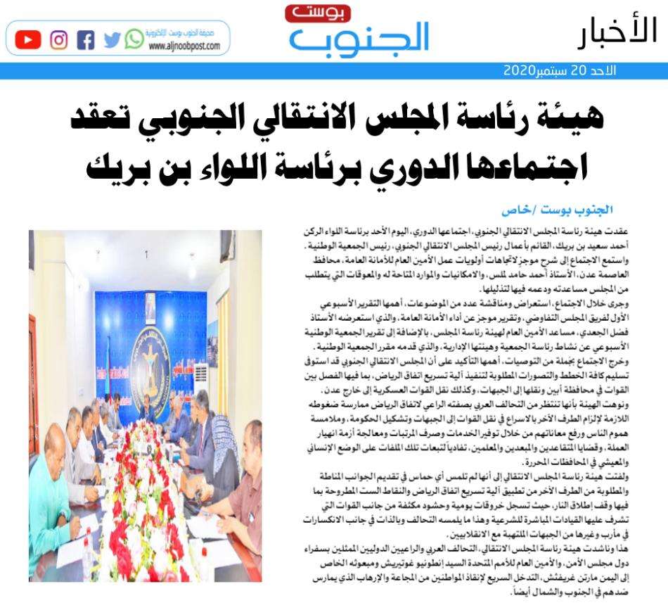 عقدت هيئة رئاسة المجلس الانتقالي الجنوبي، اجتماعها الدوري، اليوم الأحد برئاسة اللواء الركن أحمد سعيد بن بريك، القائم بأعمال رئيس المجلس الانتقالي الجنوبي، رئيس الجمعية الوطنية.