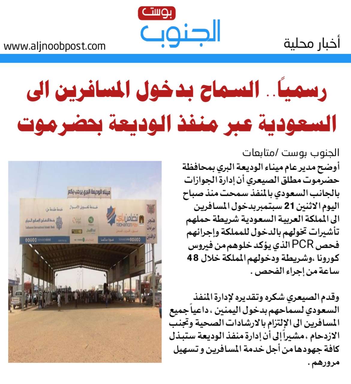 أوضح مدير عام ميناء الوديعة البري بمحافظة حضرموت مطلق الصيعري أن إدارة الجوازات بالجانب السعودي بالمنفذ سمحت منذ صباح اليوم الاثنين 21 سبتمبر بدخول المسافرين الى المملكة العربية السعودية شريطة حملهم تأشيرات تخولهم بالدخول للمملكة وإجرائهم فحص PCR الذي يؤكد خلوهم من فيروس كورونا ،وشريطة ودخولهم المملكة خلال 48 ساعة من إجراء الفحص .