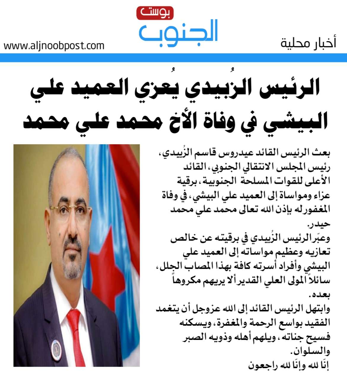 وعبّر الرئيس الزُبيدي في برقيته عن خالص تعازيه وعظيم مواساته إلى العميد علي البيشي وأفراد أسرته كافة بهذا المصاب الجلل، سائلاً المولى العلي القدير ألا يريهم مكروهاً بعده.