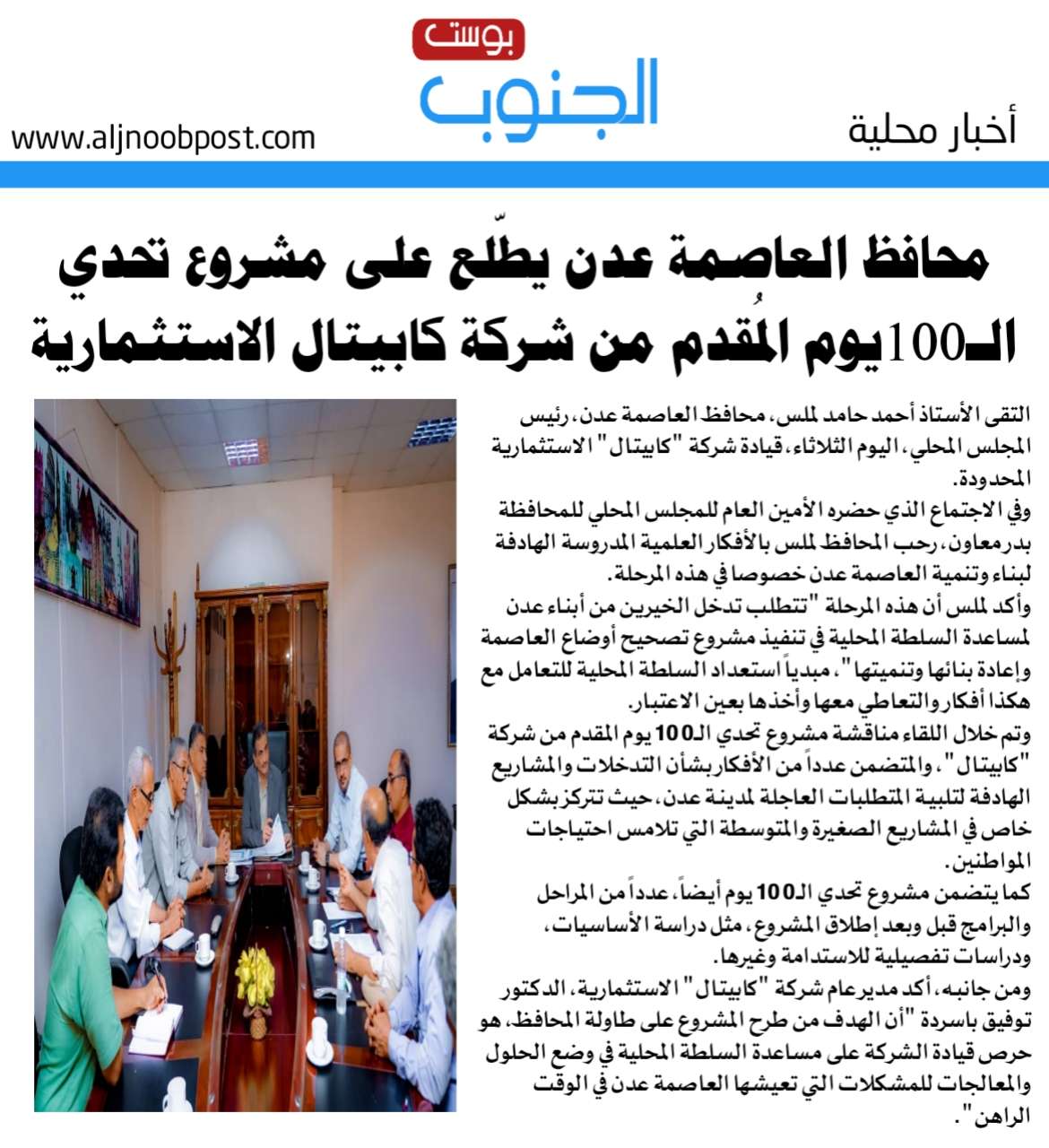 محافظ العاصمة عدن يطّلع على مشروع تحدي الـ100يوم المُقدم من شركة "كابيتال" الاستثمارية