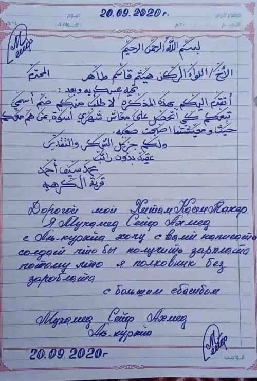 وكتب العقيد محمد سيف احمد خريج الاكاديمية العسكرية سابقا معاناته بخط يده بالغتين العربية والروسية موجهة الى اللواء هيثم قاسم طاهر يطالبه بضم اسمه لكي يحصل على راتب شهري يعيل به اسرته نظرا للحالة المعيشية الصعبة التي يعيشها .