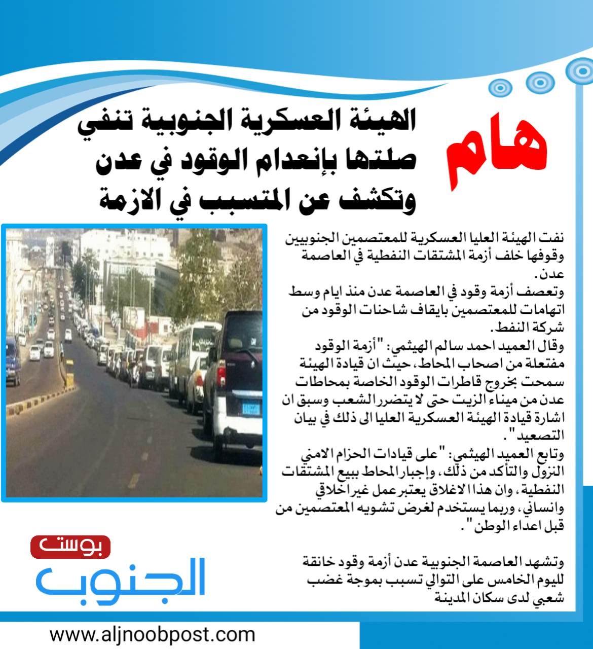 الهيئة العسكرية الجنوبية تنفي صلتها بأزمة الوقود بعدن و تتهم ملاك المحاط بافتعالها