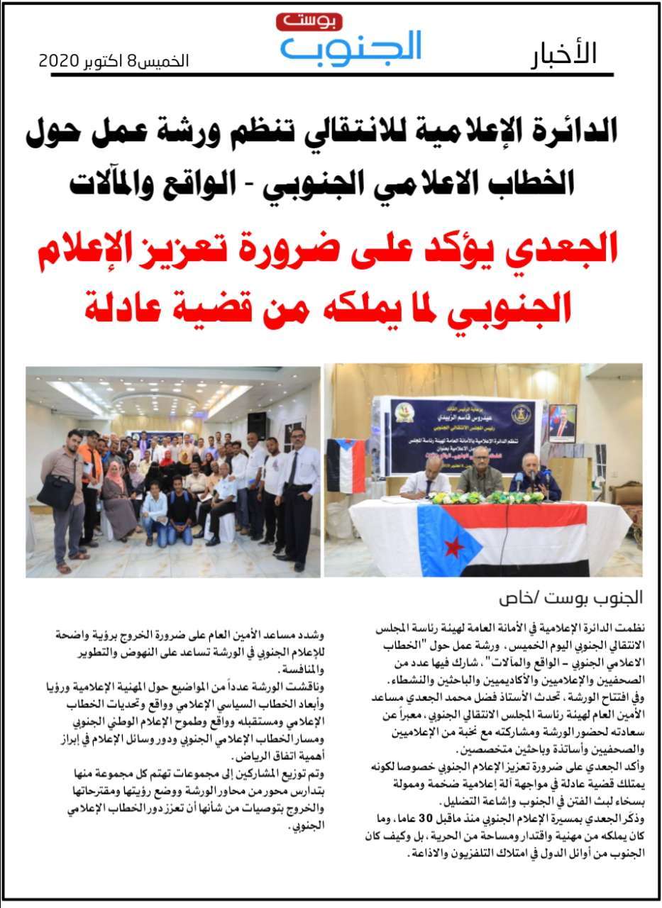 نظمت الدائرة الإعلامية في الأمانة العامة لهيئة رئاسة المجلس الانتقالي الجنوبي اليوم الخميس، ورشة عمل حول "الخطاب الاعلامي الجنوبي - الواقع والمآلات"، شارك فيها عدد من الصحفيين والإعلاميين والأكاديميين والباحثين والنشطاء.