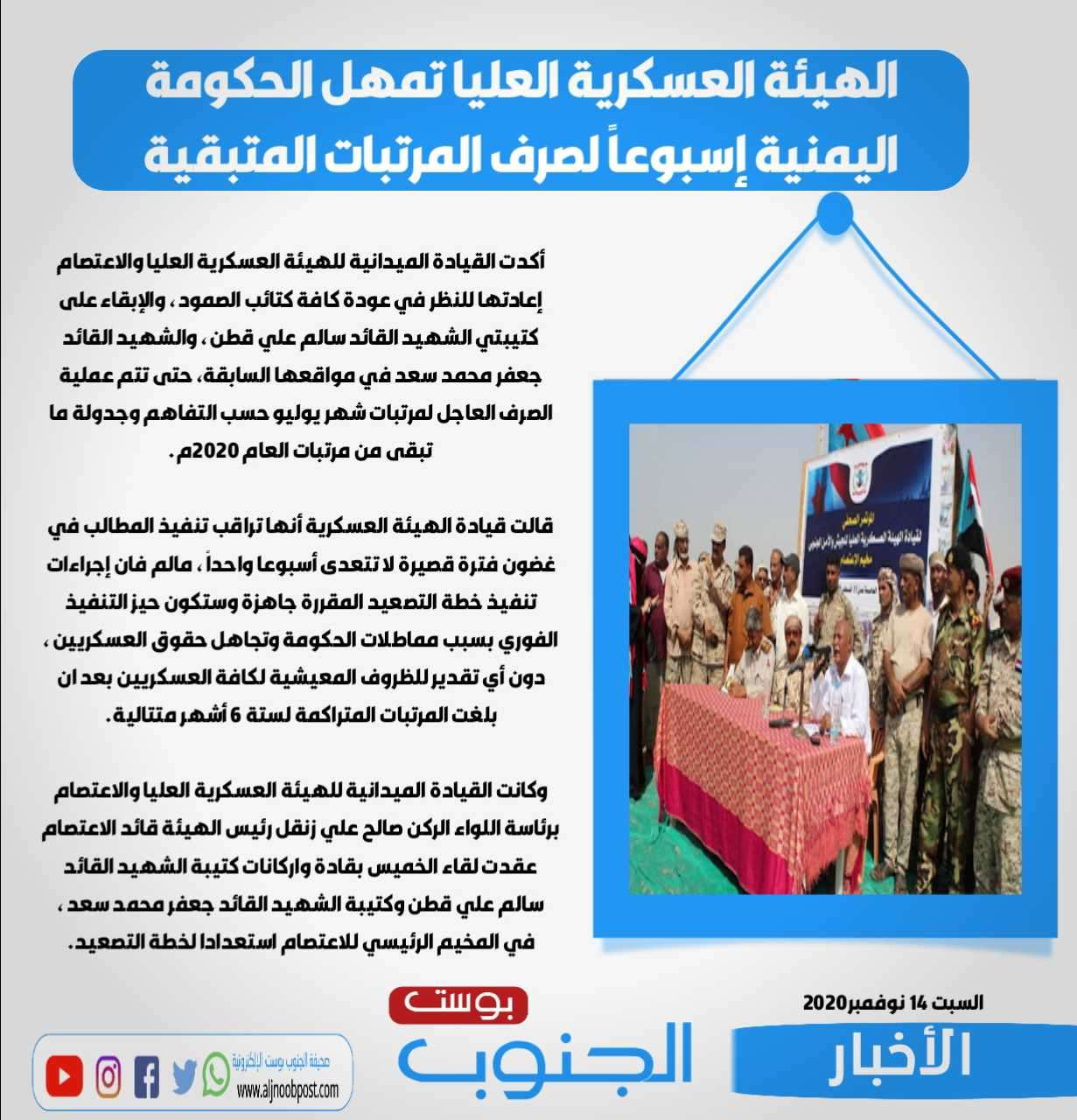 أكدت القيادة الميدانية للهيئة العسكرية العليا والاعتصام إعادتها للنظر في عودة كافة كتائب الصمود ، والإبقاء على كتيبتي الشهيد القائد سالم علي قطن ، والشهيد القائد جعفر محمد سعد في مواقعها السابقة، حتى تتم عملية الصرف العاجل لمرتبات شهر يوليو حسب التفاهم وجدولة ما تبقى من مرتبات العام 2020م.