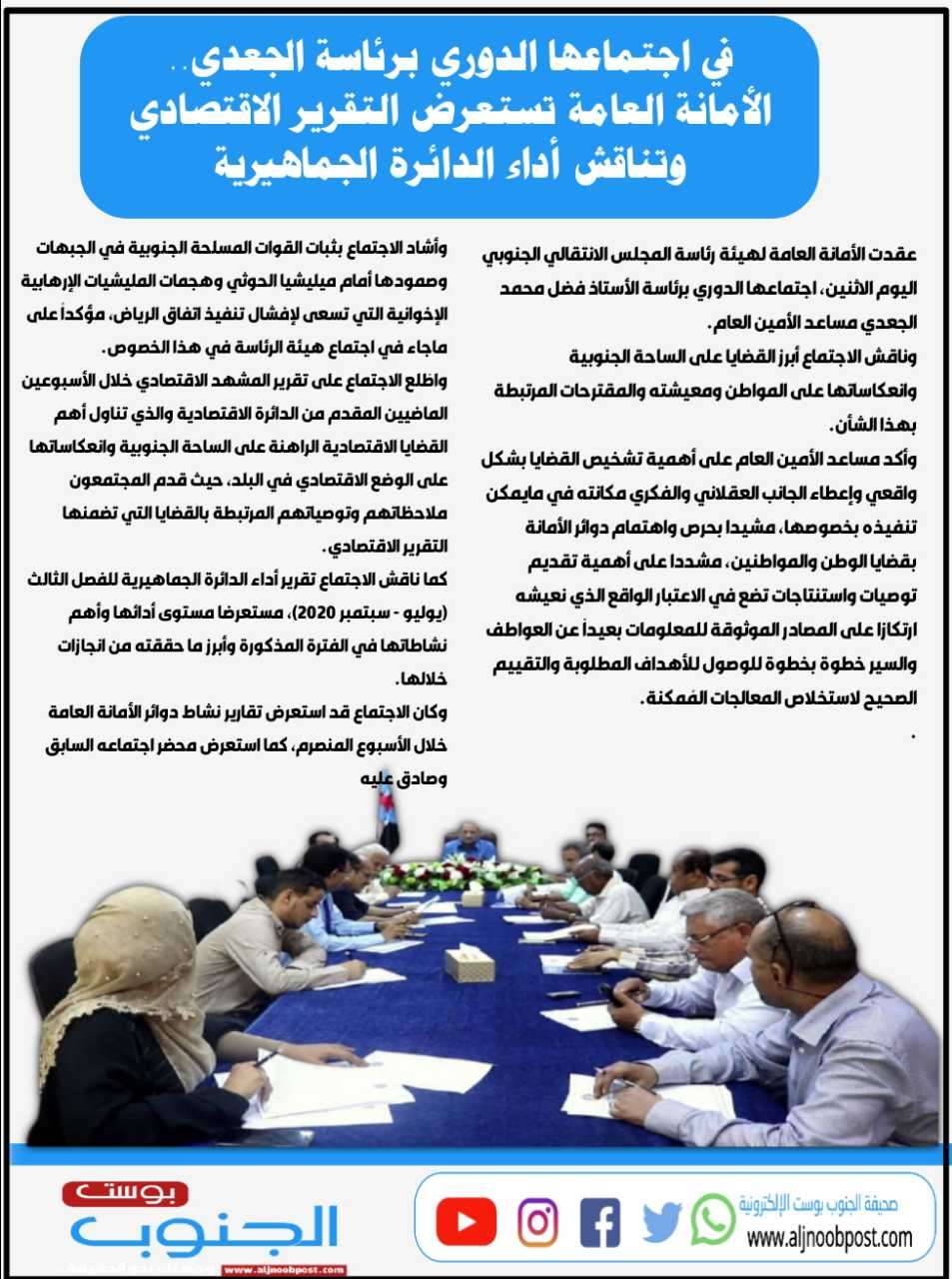 واطّلع الاجتماع على تقرير المشهد الاقتصادي خلال الأسبوعين الماضيين المقدم من الدائرة الاقتصادية والذي تناول أهم القضايا الاقتصادية الراهنة على الساحة الجنوبية وانعكاساتها على الوضع الاقتصادي في البلد، حيث قدم المجتمعون ملاحظاتهم وتوصياتهم المرتبطة بالقضايا التي تضمنها التقرير الاقتصادي.