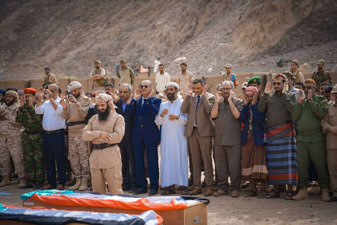 و أدّى المحافظ لملس، بمعية عدد من أعضاء هيئة رئاسة المجلس الانتقالي والجمعية الوطنية والأمانة العامة لهيئة رئاسة المجلس، وقيادات عسكرية وأمنية جنوبية، صلاة الجنازة على جثامين الشهداء، وقدم واجب العزاء لأسرهم وذويهم، سائلاً المولى العلي القدير أن يتغمد الشهداء بواسع برحمته وعفوه، ويسكنهم فسيح جناته، ويلهم أهاليم وذويهم الصبر والسلوان.