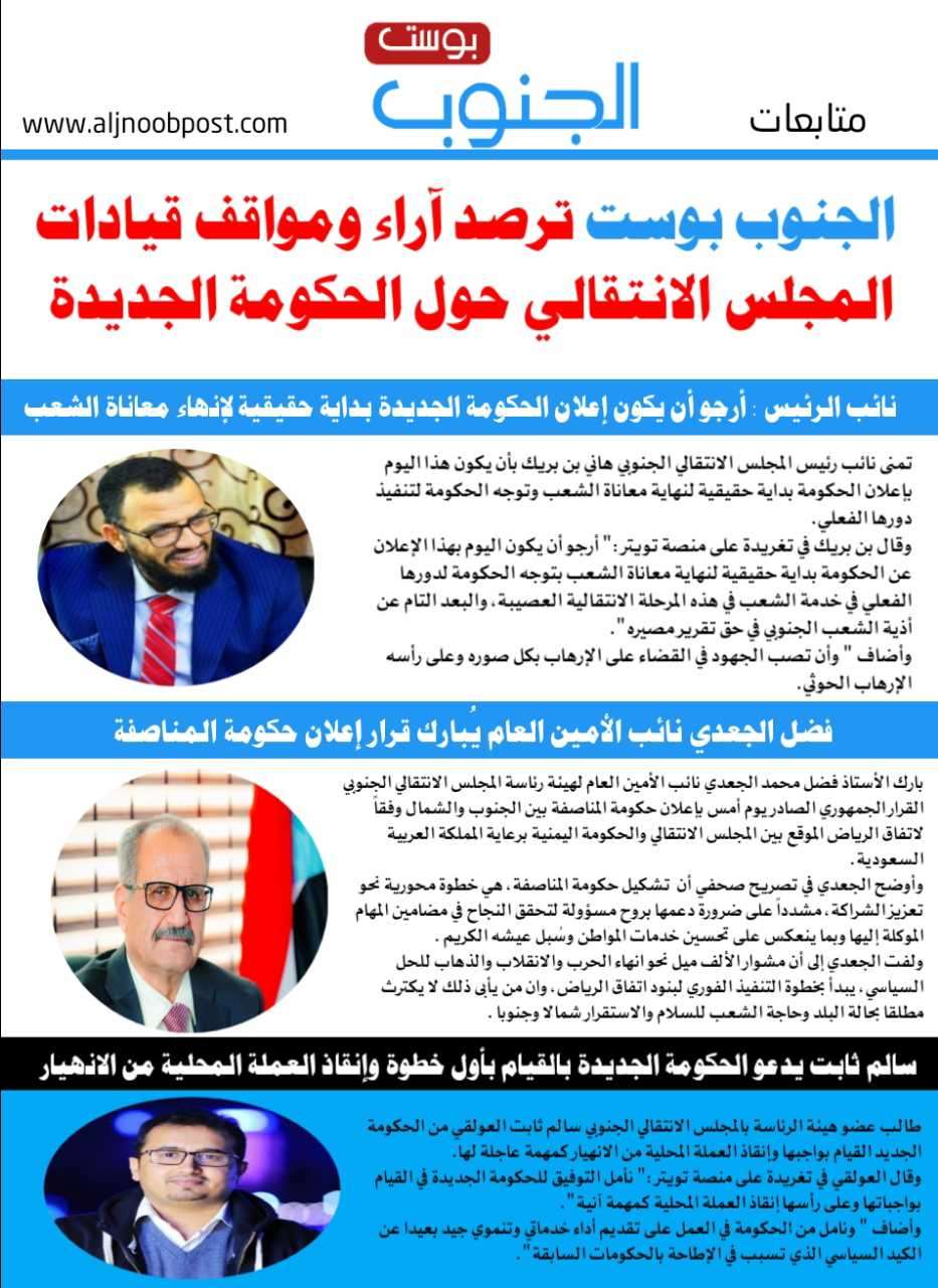 "الجنوب بوست " ترصد آراء ومواقف قيادات المجلس الانتقالي حول الحكومة الجديدة بتاريخ 2020-12-19 الساعة 19:00 الجنوب بوست /خاص