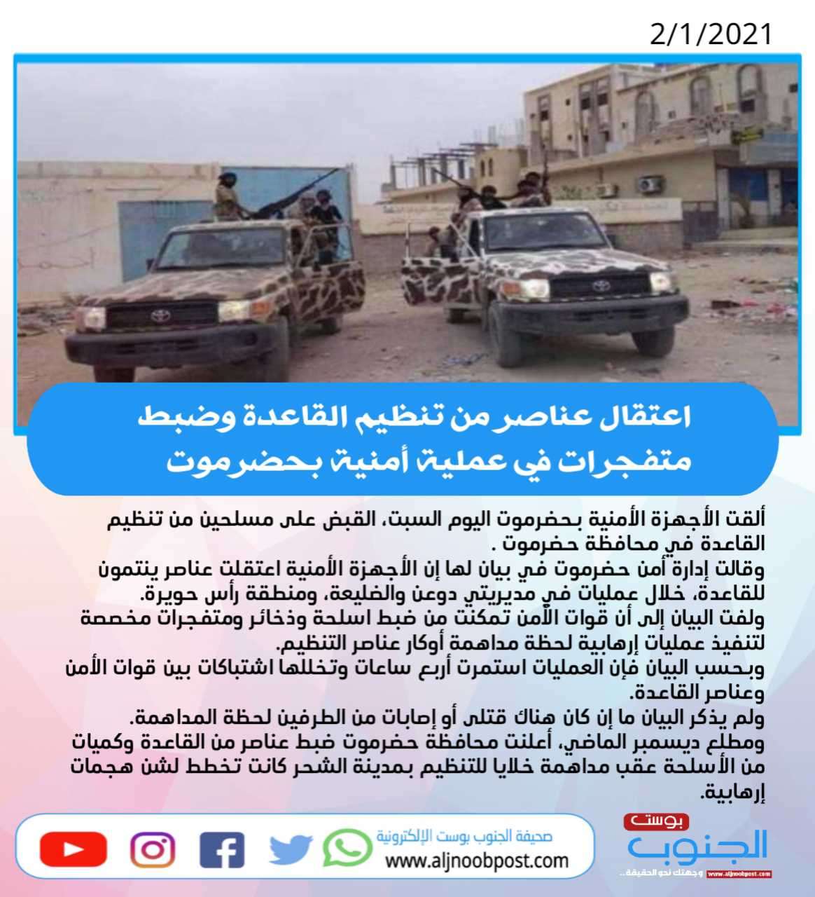 وقالت إدارة أمن حضرموت في بيان لها إن الأجهزة الأمنية اعتقلت عناصر ينتمون للقاعدة، خلال عمليات في مديريتي دوعن والضليعة، ومنطقة رأس حويرة.