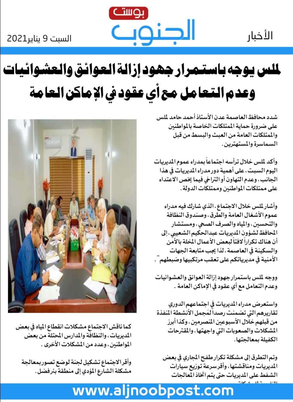 كما ناقش الاجتماع مشكلات انقطاع المياه في بعض المديريات، والنظافة والمدارس المحتلة من بعض المواطنين، وعدد من المشكلات الأخرى .