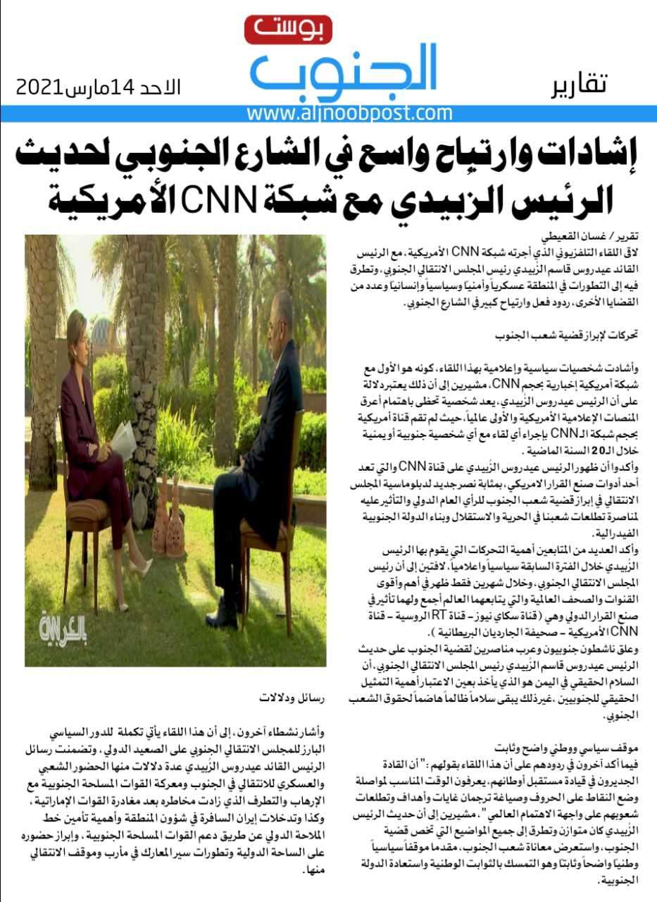 لاقى اللقاء التلفزيوني الذي أجرته شبكة CNN الأمريكية، مع الرئيس القائد عيدروس قاسم الزُبيدي رئيس المجلس الانتقالي الجنوبي، وتطرق فيه إلى التطورات في المنطقة عسكرياً وأمنياً وسياسياً وإنسانياً وعدد من القضايا الأخرى، ردود فعل وارتياح كبير في الشارع الجنوبي.