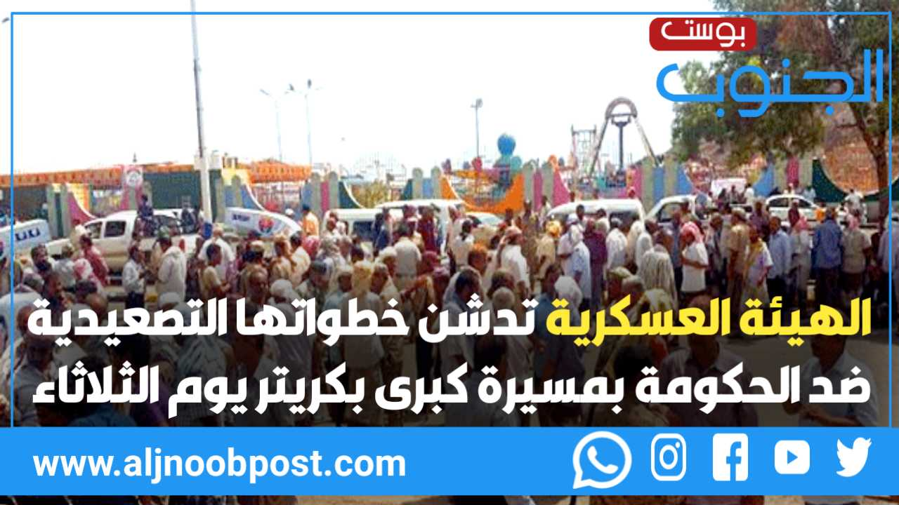 الهيئة العسكرية تدشن خطواتها التصعيدية ضد الحكومة بمسيرة كبرى بكريتر اليوم الثلاثاء