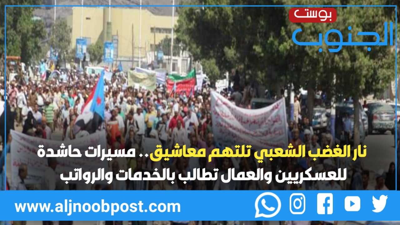 نار الغضب الشعبي تلتهم معاشيق.. مسيرات حاشدة للعسكريين والعمال تطالب بالخدمات والرواتب