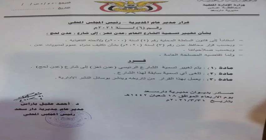 أصدر مامور مديرية دار سعد الدكتور أحمد عقيل باراس، اليوم ، قراراً إداريا بتسمية الشارع العام الممتد من جولة السفينة حتى جولة الدبابة(السلام)، في مديرية دار سعد ، باسم شارع عدن لحج.