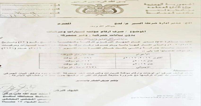 وجه محافظ محافظة لحج بوقف صرف الارقام المؤقتة للسيارات والمركبات التي لاتحمل بيانات جمركية .