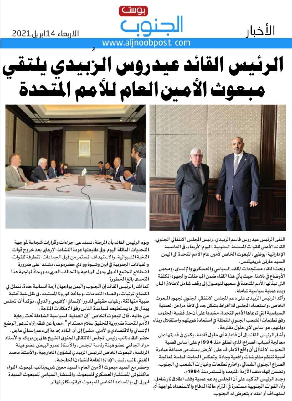 وأكد الرئيس الزُبيدي على دعم المجلس الانتقالي الجنوبي لجهود المبعوث الخاص، واستعداد المجلس للانخراط بشكل جاد في كافة مراحل العملية السياسية التي ترعاها الأمم المتحدة، مشدداً على أن حل قضية الجنوب وفق تطلعات الشعب الجنوبي المتمثلة في استعادة هويتهم واستقلال وبناء دولتهم، هو أساس لأي حلول مقترحة.