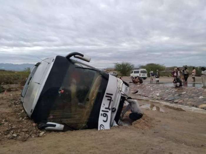 جرفت السيول اليوم الجمعة؛ حافلة نقل ركاب لشركة النقل البراق في المحفد بمحافظة أبين.