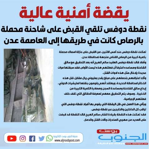 تمكنت نقطة دوفس عند أمس الاثنين، من القبض على عازلة اسماك محملة بكمية كبيرة من الرصاص القناص متجهة لمحافظة عدن.