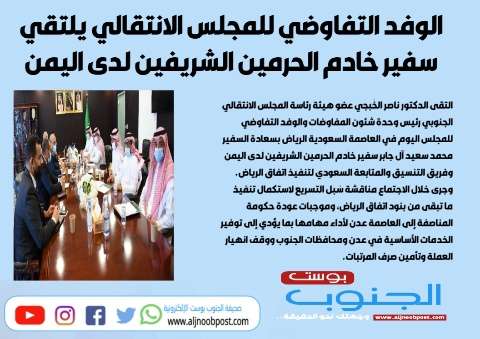التقى الدكتور ناصر الخُبجي عضو هيئة رئاسة المجلس الانتقالي الجنوبي رئيس وحدة شئون المفاوضات والوفد التفاوضي للمجلس اليوم في العاصمة السعودية الرياض بسعادة السفير محمد سعيد آل جابر سفير خادم الحرمين الشريفين لدى اليمن وفريق التنسيق والمتابعة السعودي لتنفيذ اتفاق الرياض.