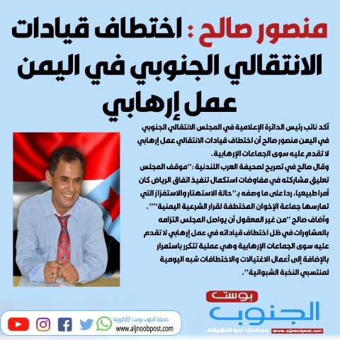 أكد نائب رئيس الدائرة الإعلامية في المجلس الانتقالي الجنوبي في اليمن منصور صالح أن اختطاف قيادات الانتقالي عمل إرهابي لا تقدم عليه سوى الجماعات الإرهابية.