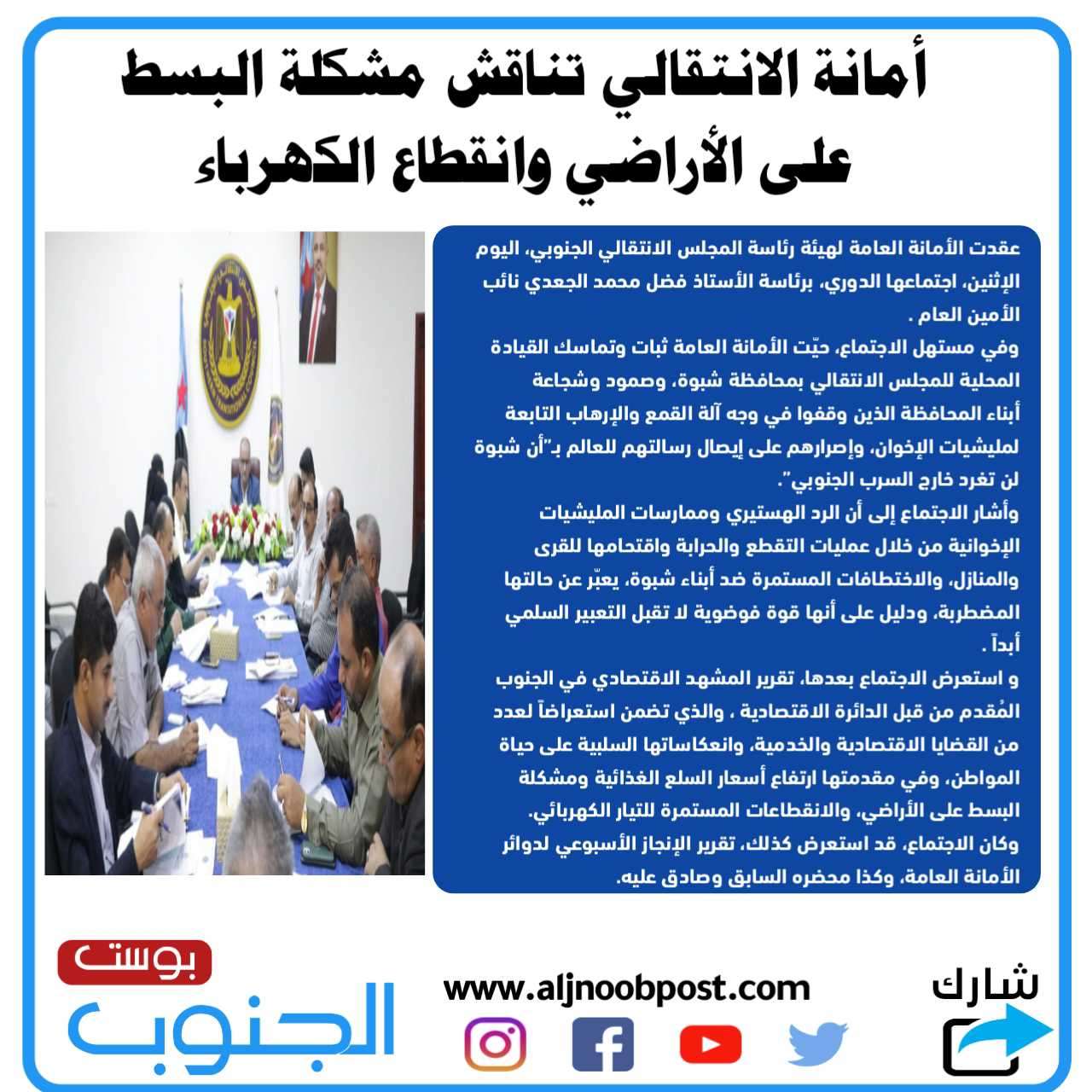 أمانة الانتقالي تناقش مشكلة البسط على الأراضي وانقطاع الكهرباء