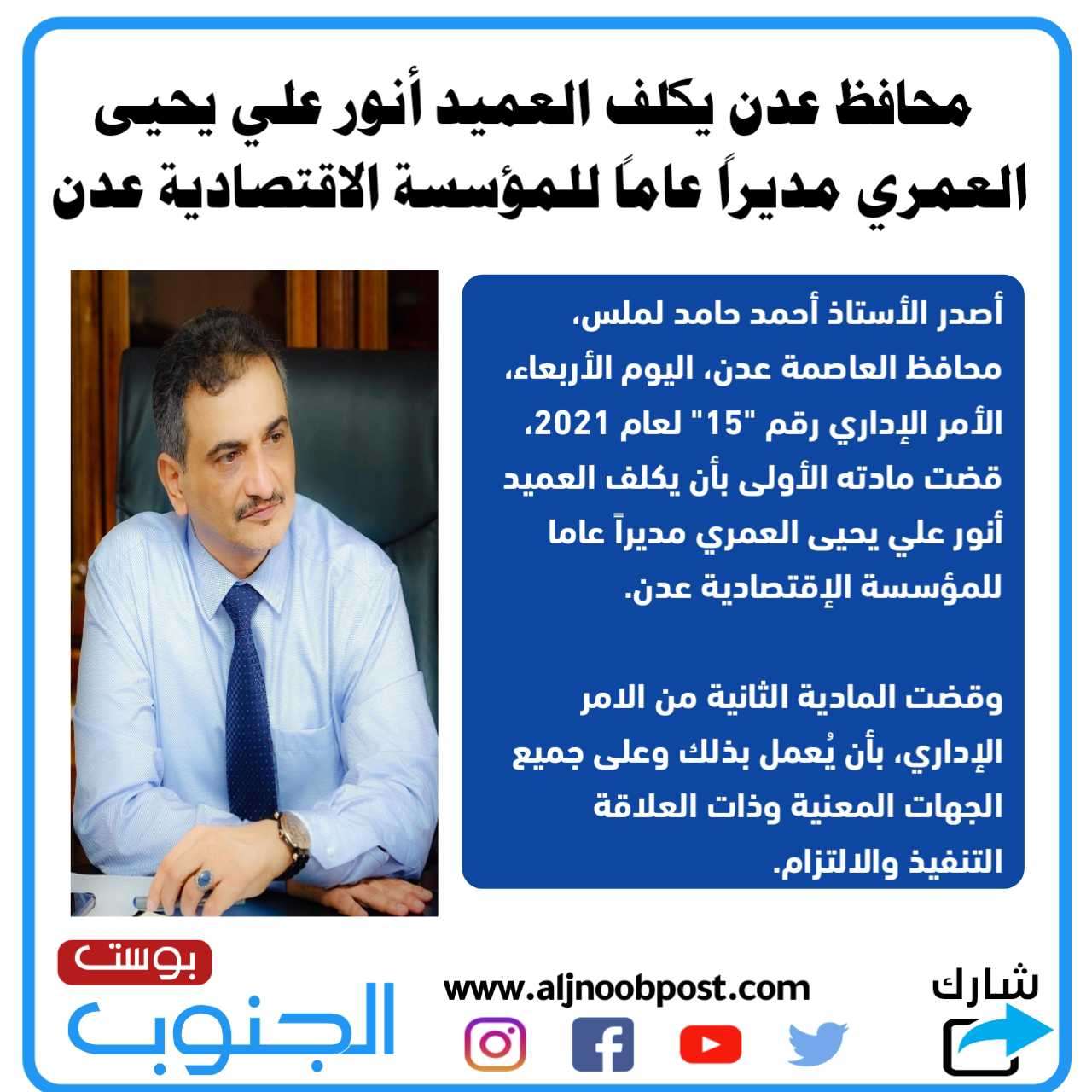 محافظ عدن يكلف العميد أنور علي يحيى العمري مديراً عاماً للمؤسسة الاقتصادية عدن