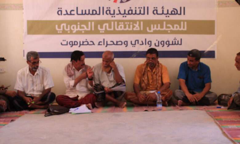 وفي هذا السياق عقدت الهيئة التنفيذية المساعدة للمجلس الانتقالي الجنوبي لشؤون مديريات وادي وصحراء حضرموت، السبت، بمقر الهيئة لقاءً تشاورياً برؤساء الهيئات التنفيذية للقيادات المحلية في مديريات وادي وصحراء حضرموت، وشباب حضرموت الأحرار، ونقابة المعلمين والتربوين الجنوبيين، ونساء حضرميات .