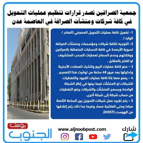 جمعية الصرافين تصدر قرارات تنظم عمليات التحويل في كافة شركات ومنشآت الصرافة في العاصمة عدن