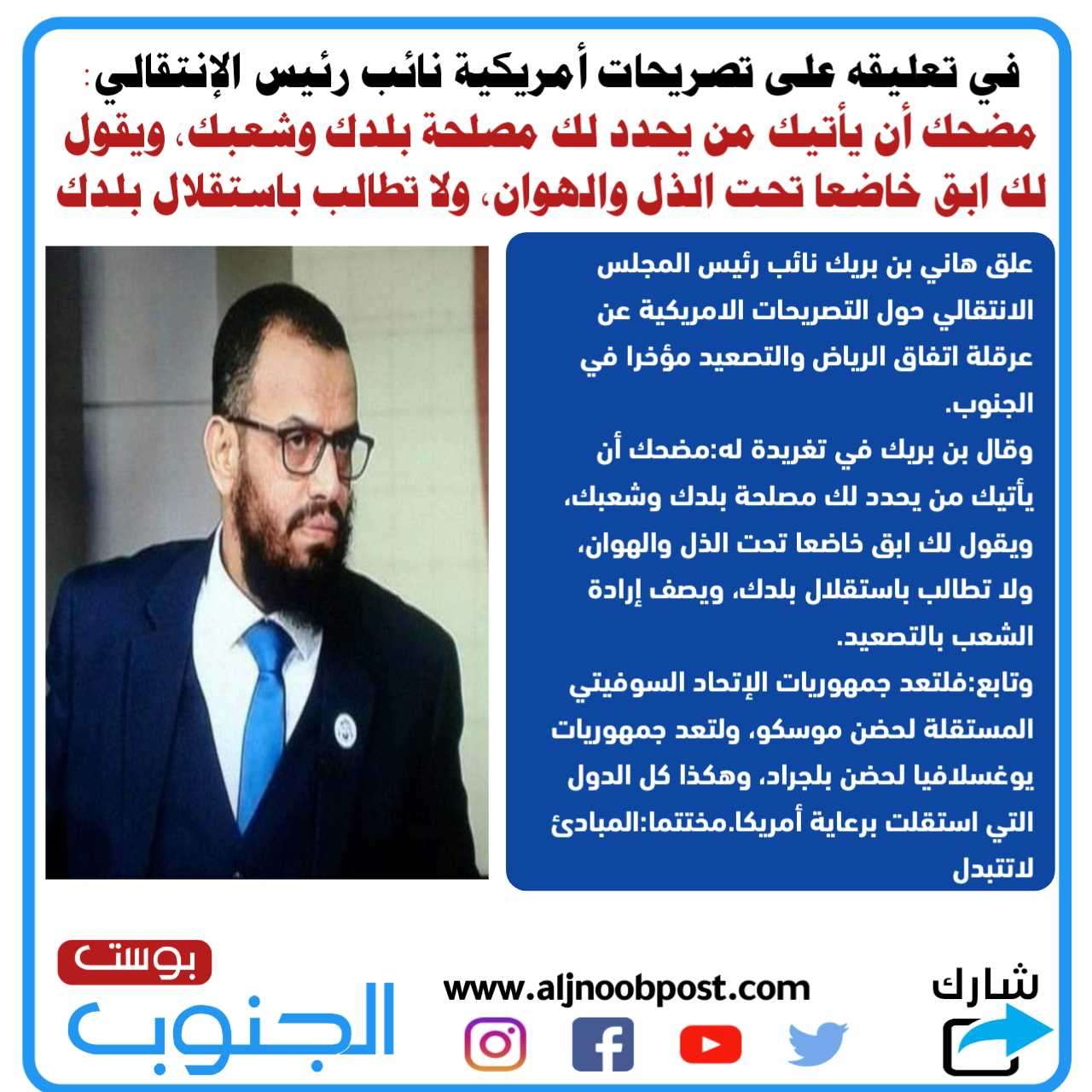 علق هاني بن بريك نائب رئيس المجلس الانتقالي حول التصريحات الامريكية عن عرقلة اتفاق الرياض والتصعيد مؤخرا في الجنوب.