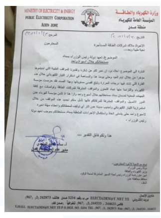 في بيان لها عبرت أدارة كهرباء العاصمة عدن عن استيائها من ملاك الطاقة المستأجرة وذلك لرفضهم مهلة أسبوع واحد بموجب تعهد رئيس الوزراء بدفع مستحقاتهم.