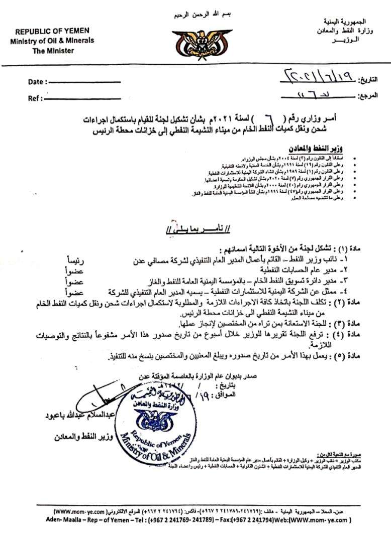 ولفتت المصادر إلى أن اللجنة المشكلة بقرار وزير النفط والمعادن الدكتور عبدالسلام باعبود والتي يرأسها الدكتور سعيد الشماسي نائب وزير النفط القائم باعمال المدير التنفيذي لشركة مصافي عدن وعضوية عدد من الكوادر المختصة في الوزارة والمكلفة بتزويد محطة الرئيس بالوقود قد استكملت الترتيبات الفنية الخاصة بنقل الوقود الخام من ميناء النشيمة الى المحطة.