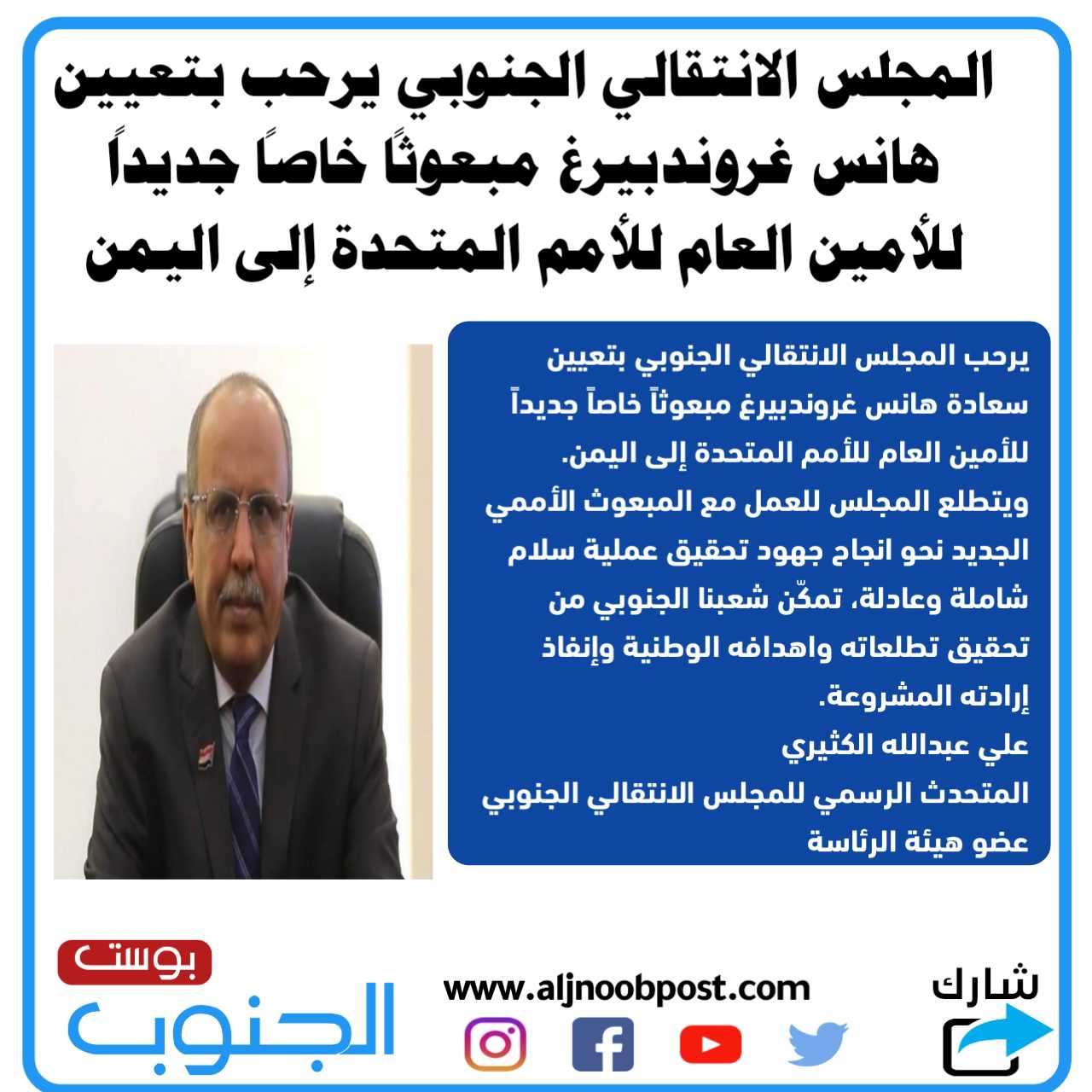 المجلس الانتقالي الجنوبي يرحب بتعيين هانس غروندبيرغ مبعوثاً خاصاً جديداً للأمين العام للأمم المتحدة إلى اليمن