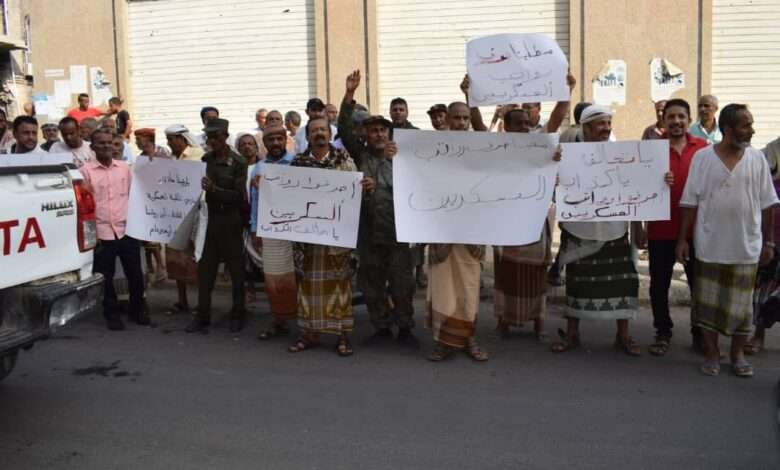تظاهر العشرات من العسكريين امام بوابة البنك المركزي بالعاصمة عدن للمطالبة بصرف مرتباتهم المنقطعة منذ نحو 8 اشهر