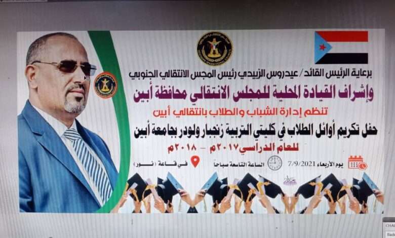 برعاية الرئيس القائد عيدروس قاسم الزبيدي رئيس المجلس الانتقالي الجنوبي ،وأشراف القيادة المحلية لانتقالي أبين ، تنظم ادارة الشباب والطلاب بالمحافظة حفل تكريمي لاوائل طلاب الجامعة في كليتي التربية زنجبار ولودر للعام الدراسي 2017-2018 م .